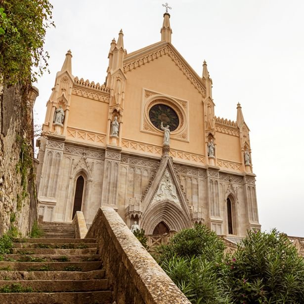 Il Tempio di San Francesco è uno dei simboli più iconici di Gaeta, fondato originariamente dal Santo stesso nel 1222 durante il suo soggiorno in città. L'attuale maestosa veste neogotica si deve ai restauri del XIX secolo voluti da Ferdinando II di Borbone, che trasformarono l'antica struttura in un capolavoro di guglie e pinnacoli. Si distingue per la sua scenografica scalinata monumentale dominata dalla statua della Religione e per la facciata slanciata che svetta sul centro storico. Dalla sua posizione elevata sul promontorio, offre una delle viste panoramiche più spettacolari e fotografate sull'intero Golfo di Gaeta.